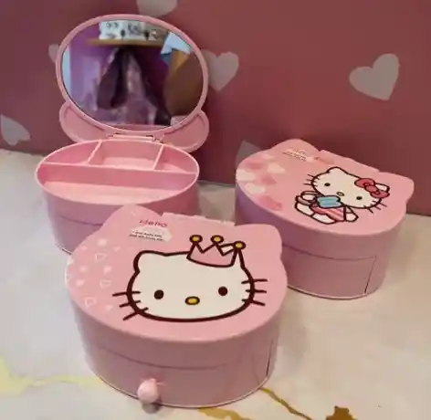 Forma de corazón: La cosmetiquera tendrá una forma de corazón distintiva. Color rosado: El color predominante será el rosado, en diferentes tonalidades. Motivos de Hello Kitty: Incluirá imágenes de Hello Kitty, posiblemente con detalles como lazos, flores o su característico moño. Detalles adicionales: Podría tener detalles como brillantina, lentejuelas o texturas especiales.