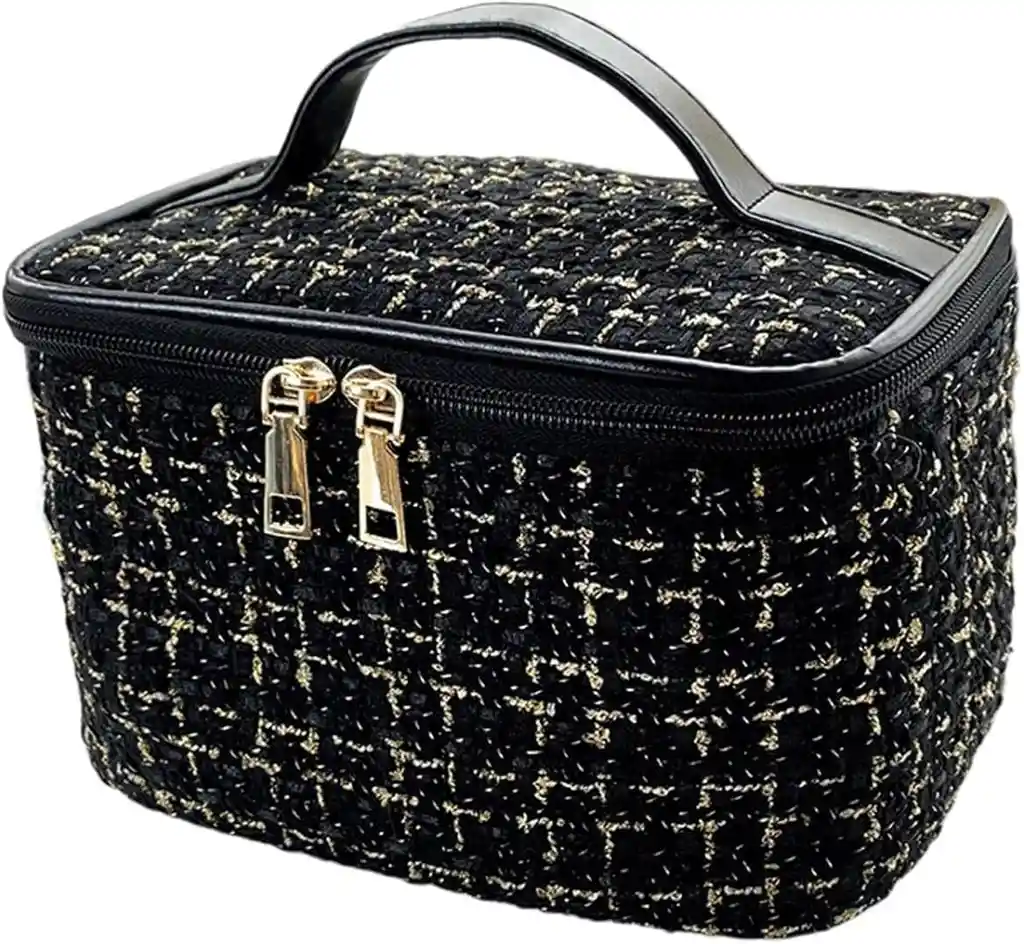 AL0000002163 MATERIAL DE ALTA CALIDAD Bolsa de cosméticos fabricada en tela de poliéster resistente con tejido de punto por urdimbre, diseñada para ofrecer durabilidad y uso prolongado. Su material firme protege tus artículos personales y mantiene la forma del estuche. DISEÑO ESPACIOSO Y FUNCIONAL Tamaño: 22 x 15 x 14 cm (8.66 x 5.91 x 5.51 pulgadas). Ofrece amplio espacio para guardar maquillaje, cremas, productos de cuidado personal e incluso joyas. Su tamaño generoso permite organizar tus artículos sin amontonarlos, manteniéndolos siempre accesibles y ordenados. BOLSILLO INTERIOR CON CREMALLERA Incluye bolsillo interno de malla con cierre, ideal para almacenar objetos pequeños y evitar que se pierdan o se dañen. Perfecto para brochas, accesorios o artículos delicados durante viajes. DISEÑO DE CUADROS DORADOS ELEGANTE El patrón de cuadros dorados aporta un toque sofisticado y moderno. Su diseño elegante y versátil la hace ideal tanto para uso diario como para viajes, complementando fácilmente cualquier estilo. CÓMODA Y PORTÁTIL Equipada con asa resistente para fácil transporte. Ideal para viajes de negocios, vacaciones o uso diario. Permite llevar tus productos de belleza de forma práctica y organizada en todo momento. INCLUYE: 1 Bolsa de cosméticos con asa y bolsillo interior con cremallera