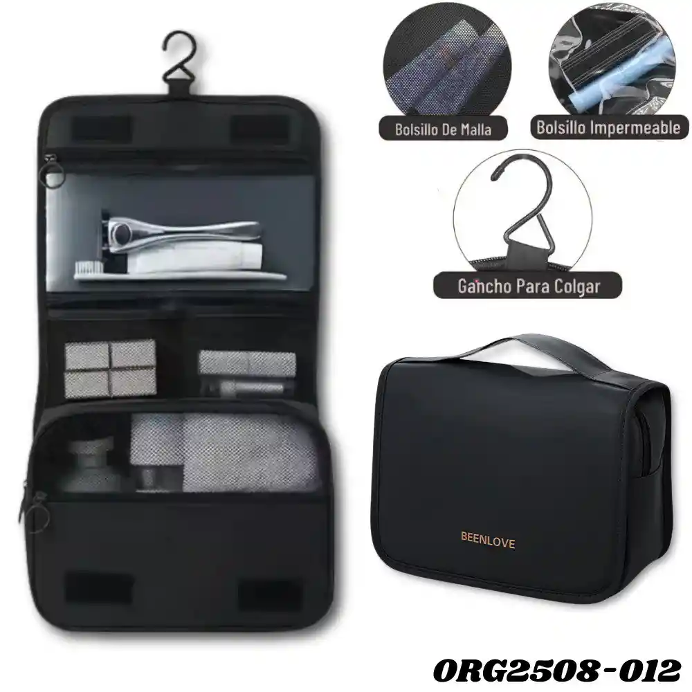 Cosmetiquera Organizador De Viaje Bolsa De Almacenamiento Portatil Organizador Cosmeticos Negro Viaja sin estrés y mantén tus productos de aseo personal impecables con este Organizador de Cosméticos Colgante. Diseñado para ahorrar espacio en la maleta y maximizar la comodidad en el hotel, este estuche se despliega verticalmente para mostrar todos tus artículos a la vez, evitando que tengas que revolver todo para encontrar tu cepillo de dientes o tu crema favorita. Características: - Diseño con Gancho para Colgar: Equipado con un gancho resistente y antideslizante en la parte superior. Simplemente cuélgalo en el toallero, la puerta del baño o el perchero para tener acceso instantáneo a tus productos sin ocupar espacio en el lavamanos. - Bolsillo Superior Impermeable: Un compartimento transparente ideal para cepillos de dientes o artículos húmedos, fácil de limpiar. - Bolsillos de Malla: Dos secciones intermedias de malla transpirable que permiten ver el contenido y favorecen el secado de los artículos. - Compartimento Principal: Un espacio amplio en la base para botellas más grandes, proporcionando así un almacenamiento más completo para tus produtos. - Bolsillo Trasero: Un espacio extra en la parte exterior para artículos planos de acceso rápido. - Material Impermeable y Resistente: Protege tus pertenencias de salpicaduras en el baño y evita que derrames internos manchen el resto de tu equipaje. - Portátil y Compacto: Se pliega convirtiéndose en un elegante maletín de mano con una manija reforzada para un transporte cómodo y seguro. - Cierre de Velcro: Sus solapas se aseguran firmemente con velcros, manteniendo el organizador cerrado y compacto durante el viaje. Especificaciones: - Tipo: Neceser de Viaje Colgante. - Cierre: Cremalleras suaves y Velcro. - Asa: Superior reforzada. Nota: Las imágenes publicadas son de referencia, el producto real puede presentar ligeras variaciones en su tonalidad de color