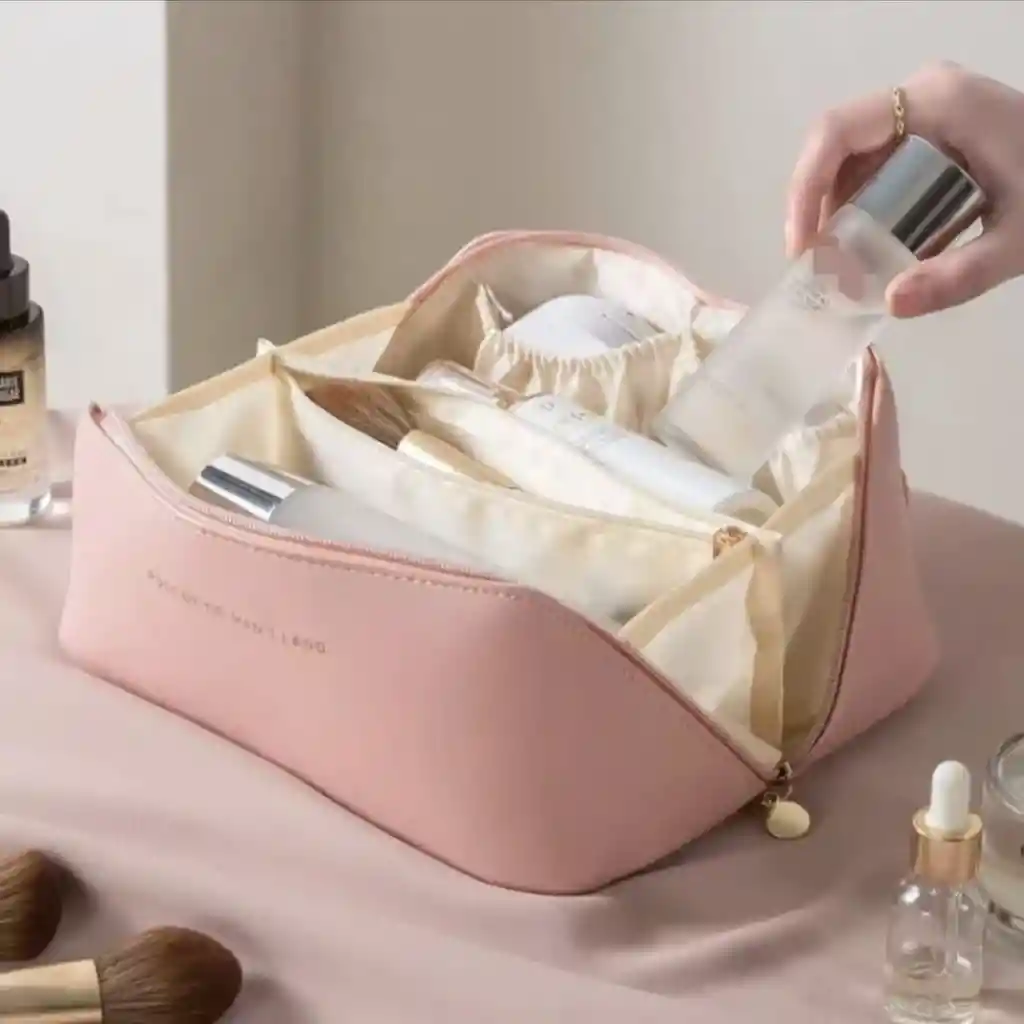 Medidas: 24 x 13 x 14 cm Con gran capacidad y 4 compartimientos, uno de ellos con cremallera interna, es perfecta para mantener tus productos organizados. Versátil y Práctica: Ideal para llevar en tus viajes, a la oficina o para mantener tu tocador en orden. Cuenta con una manija resistente para facilitar su transporte. Uso Multifuncional: 1. Maquillaje: Organiza tus labiales, bases, brochas, polvos compactos y perfumes. Incluye un bolsillo con cierre especial para tus brochas. 2. Cuidado Facial: Perfecta para llevar tus sérums, cremas hidratantes, desmaquillantes y algodones. 3. Aseo Personal: Ideal para crema dental, cepillos de dientes, aceites, cepillo de cabello y productos en tamaño de viaje.