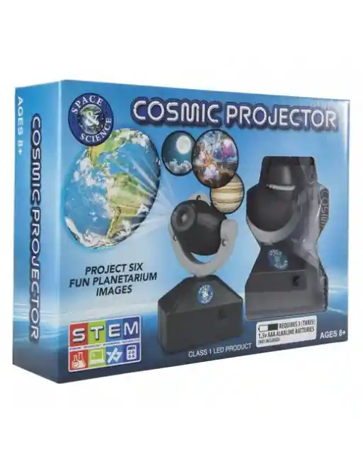 lleva el espacio exterior a tu propio hogar con este proyector cósmico. ¡pon el universo al alcance de tu mano y proyecta 6 divertidas imágenes de planetario donde quieras! ideal para pequeños astronautas y mentes curiosas. Requiere 3 pilas alcalinas AAA de 1,5 V (no incluidas) edades: 8+ (peligro de asfixia) país de origen: importado