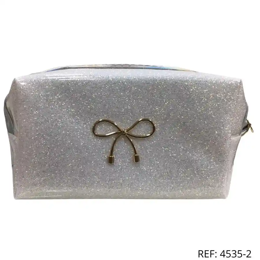 Cosmetiquera blanca escarchada con diseño brillante. Perfecta para llevar en bolso o viaje.