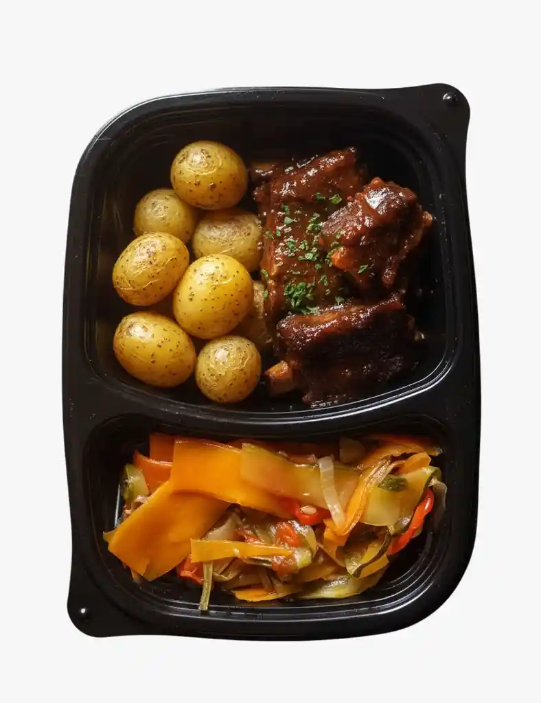 Comida congelada lista para calentar. Ingredientes: Costillas de cerdo (costillas, salsa BBQ , cebolla larga, miel, salsa soya, paprika, pimienta negra molida) Vegetales salteados (Zanahoria, zucchini verde, cebolla, cabezona blanca, pimentón, aceite de oliva, ajo), papas criollas, sal, orégano.