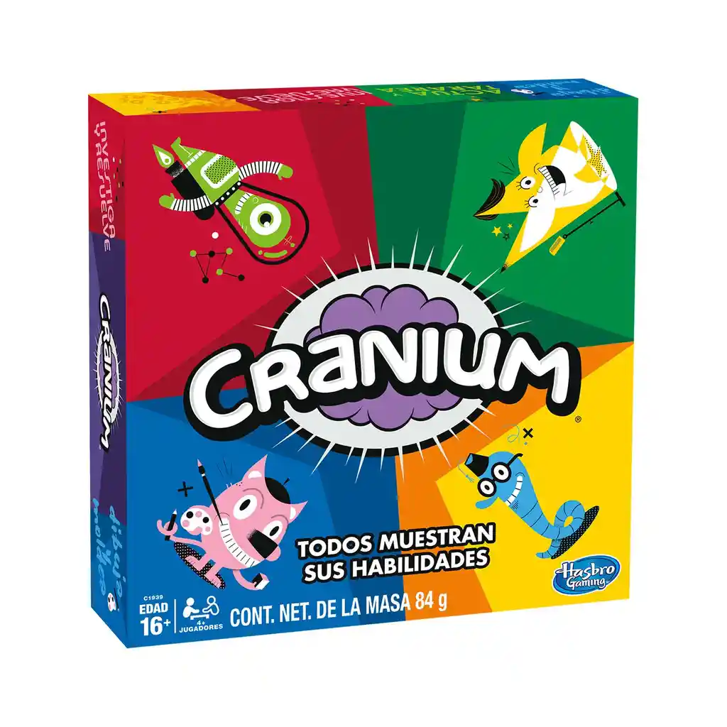 "El juego Cranium incluye 600 desafíos mentales (y corporales). Los jugadores se unen y completan divertidas actividades de 4 categorías. Dado que las actividades abarcan talentos, todos los jugadores pueden tener la oportunidad de mostrar en qué son buenos, ya sea para deletrear, esculpir, hacer rompecabezas, actuar o tararear. El Cranium Game es una diversión increíble para todos. Simplemente navegue por el tablero de juego completando actividades codificadas por colores dentro del límite de tiempo de 1 minuto. Llega al espacio de Cranium Central y completa un desafío final para ganar. +16 años. +4 jugadores."