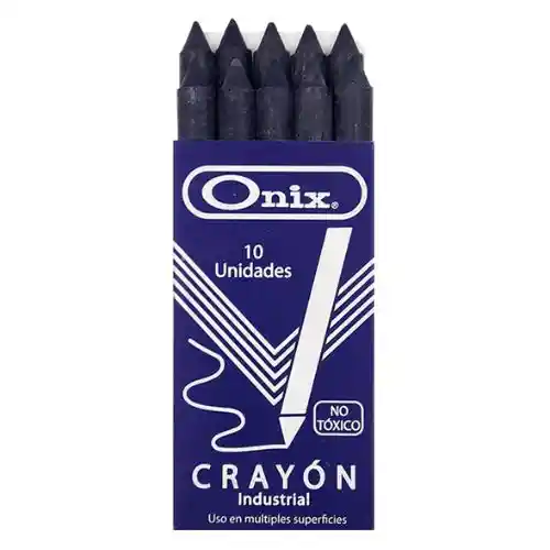 El paquete de crayones Ónix vienen de 10 unidades de un único color . Sirve para marcar caucho, madera, vidrio, cartón y plástico. Los crayones NO SON TÓXICO, son ergonómicos y de alta cremosidad. De colores intensos y brillantes y aplicación uniforme. No manchan ni dejan grumos y están libres de materiales pesados. Está compuesto de grasas minerales, cargas y pigmentos no tóxicos. Extra resistente Extra duro De fácil deslizamiento Extra grueso Apto para superficies porosas.
