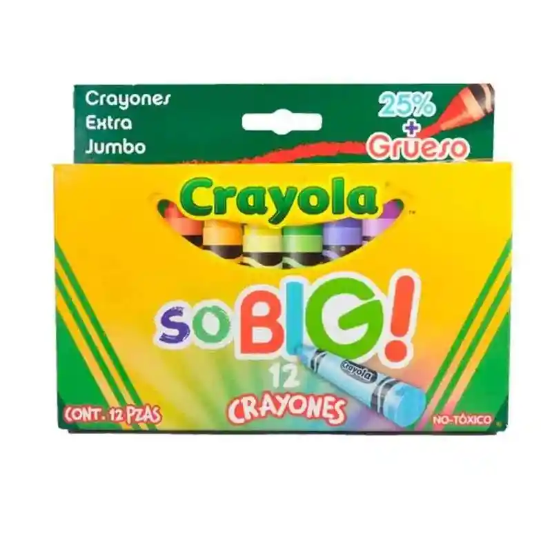 ● 12 crayones extra jumbo So Big ● Son extra resistentes, por lo que no se rompen fácilmente ● Ideales y funcionales para uso artísticos escolar ● 25% más gruesos que los crayones clásicos ● Colores reales, no tóxico