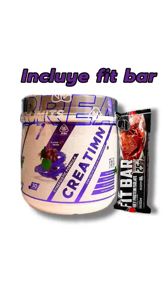 Creatina Imn 30 Servicios 600 Grs Sabor Uva Incluye barra de proteina CREATIMN es una fórmula sinérgica que mezcla componentes con una alta evidencia científica en la mejora del rendimiento deportivo. Con 4 gramos de Creatina HCL garantiza la mejora de la fuerza y el volumen muscular adicionado también se encuentran 2 gramos de L-Leucina, la principal responsable de la síntesis de proteína y por lo tanto un coadyuvante a los procesos de hipertrofia. También su formula contiene 2 gramos de Betina, la responsable de reducir la sensación de fatiga muscular, permitiendo mejores entrenos por último 3 gramos de glutamina, el aminoácido mas abundante en el músculo esquelético, ayudando a la recuperación y mejorando la salud intestinal de manera eficiente.