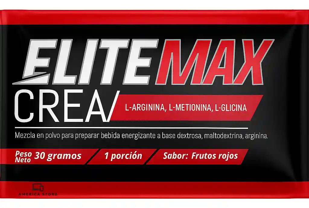 America Store te trae Creatina Monohidratada Elite Max Frutos Rojos X24 Mezcla en polvo para preparar bebida energizante con creatina monohidratada y precursores de la creatina que incentivan su desarrollo natural en el cuerpo (aginina, metionina y glicina), Con Taurina. MODO DE PREPARACIÓN Disolver el producto (30gr) en un vaso (300ml) de agua y mezclar bien, para obtener un mejor perfil sensorial, prepárelo en agua fria. INGREDIENTES Ingredientes: Dextrosa, maltodextrina, proteína de suero, sabor artificial a frutos rojos, arginina, metionina, glicina, creatrina monohidratada, taurina, cafeína, ácido cítrico /regulador de acidez), colina, calcio (fosfato tricálcico), tiamina (vitamina B1), ácido pantoténico (vitamina B5), piridoxina (vitamina B6)