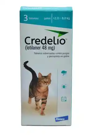 Credelio se comercializa en pastillas masticables de administración oral que se le pueden ofrecer al gato con la comida o durante los treinta minutos posteriores. Las presentaciones disponibles son credelio de 12 mg para gatos de peso comprendido entre el medio kg y los 2 kg. Para gatos más grandes, de entre 2 y 8 kg de peso, existe credelio de 48 mg. Si el gato pesa más de estos 8 kg, la dosis se ajustará combinando varios comprimidos para acercarse al máximo a su peso, teniendo en cuenta que la dosis recomendable oscila entre los 6 y los 24 mg por kg. Será el veterinario quien establezca la dosis más adecuada a nuestro gato, de manera que no recomendamos administrar credelio, ni ningún otro fármaco, sin su consentimiento. Para un control óptimo de las infestaciones por garrapatas y pulgas, el medicamento veterinario debe administrarse a intervalos mensuales y mantenerse a lo largo de la temporada de pulgas o de garrapatas en función de las situaciones epidemiológicas locales.