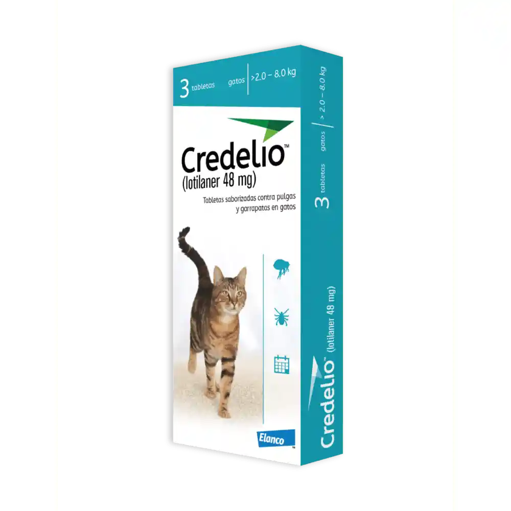 Credelio gatos (Lotilaner) fue diseñado especialmente para los gatos. ILos gatos escogieron el olor y el sabor – no los investigadores!. Para su uso en gatos y gatitos a partir de las 8 semanas de edad y 0.5 kg de peso, para el tratamiento y prevención de infestaciones de pulgas (Ctenocephalides felis y C. canis). Para su uso en gatos y gatitos a partir de los 6 meses de edad y 0.5 kg de peso, para el tratamiento y control de infestaciones de garrapatas (Ixodes ricinus y I.scapularis). Credelio puede ser usado como parte de la estrategia del tratamiento de la Dermatitis Alérgica a la Picadura de la Pulga (DAPP).