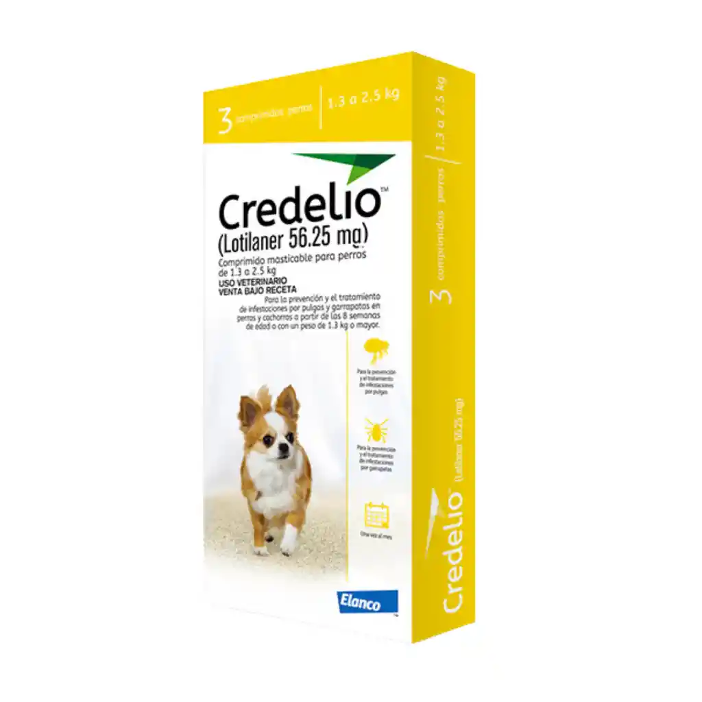BIENVENDIS A VETMAK El Credelio es un antiparasitario para perros y cachorros que pesan entre 1.3 kg y 2.5 kg. Aquí tienes algunos detalles importantes sobre este producto: Composición: Contiene Lotilaner. Modo de administración: Se suministra vía oral y puede darse con comida o solo. Efecto: Proporciona un efecto garrapaticida y pulguicida de acción rápida que dura un mes. Eliminación de garrapatas: Durante todo un mes, Credelio elimina las garrapatas de nuevas infestaciones12. Compatibilidad: Es compatible con otros medicamentos y ha sido ampliamente testeado en más de 70 razas, incluyendo a los collies3. Recuerda administrarlo mensualmente junto con las comidas o en los 30 minutos posteriores a la alimentación4. ¡Espero que esta información te sea útil!