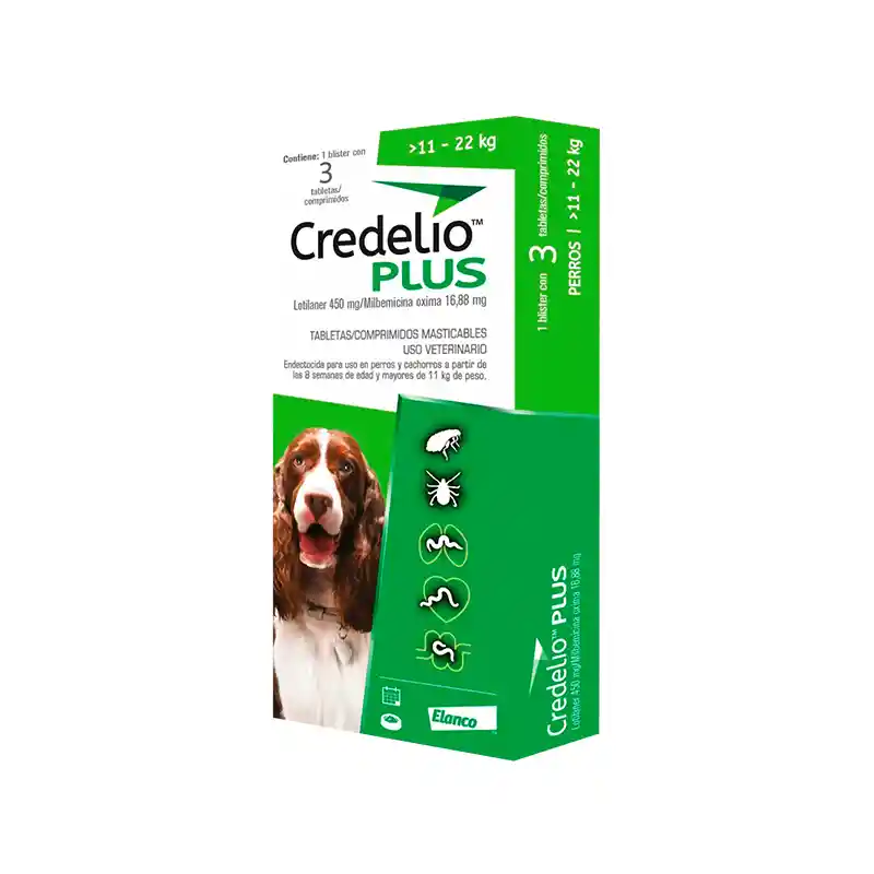 Composición Lotilaner + Milbemicima Oxima Descripción Credelio PLUS™ (Lotilaner + Milbemicina Oxima) es una solución integral para la protección de sus pacientes caninos contra pulgas, garrapatas, gusanos intestinales, gusano del corazón y gusano pulmonar. Seguro para perros a partir de 1.4 kg y 8 semanas de edad. Tableta masticable ideal para facilitar su administración.