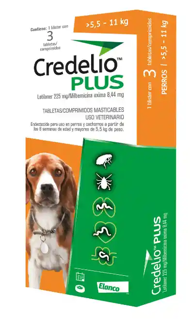 Credelio Plus para perros es un antiparasitario oral en tableta masticable que ofrece protección de amplio espectro contra parásitos externos (pulgas, garrapatas) e internos (lombrices intestinales como ascárides, ancilostomas, tricocéfalos, y gusano del corazón). Combina dos principios activos, Lotilaner y Milbemicina oxima, se administra mensualmente con o después de las comidas y es efectivo incluso contra ácaros como Demodex, siendo una solución completa para la salud parasitaria canina. Qué es y para qué sirve Acción múltiple: Elimina pulgas, garrapatas, gusanos del corazón (dirofilaria), gusanos pulmonares (angiostrongilosis) y lombrices intestinales comunes. Doble protección: Combate parásitos internos y externos en una sola dosis mensual. Tratamiento de ácaros: También se utiliza para tratar ácaros Demodex. Prevención: Ayuda a prevenir infestaciones futuras y la dermatitis alérgica por pulgas (DAP). Características principales Administración: Tableta masticable, sabrosa (sabor a hígado de cerdo) y fácil de dar. Dosificación: Mensual, idealmente administrada con alimento para mejor absorción. Seguridad: Apto para cachorros desde las 8 semanas de edad y diferentes rangos de peso. Diferencia con Credelio (sin Plus) Credelio: Se enfoca en pulgas, garrapatas y ácaros. Credelio Plus: Añade la protección contra parásitos internos (lombrices y gusano del corazón).