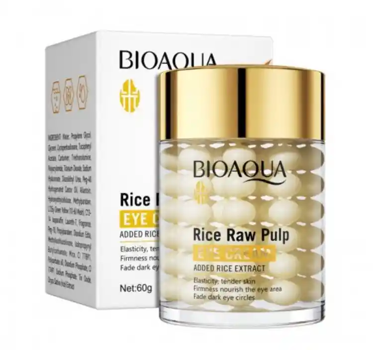Crema de Esencia de Pulpa de Arroz (Rice Raw Pulp Essence Cream) de Bioaqua. Contiene extractos concentrados de arroz en forma de perlas. Ayuda a reponer la humedad y los nutrientes de la piel. Ilumina el tono de la piel, dejándola suave y blanca. Forma una capa protectora contra las bacterias que causan acné. Tiene propiedades antienvejecimiento gracias a sus antioxidantes.