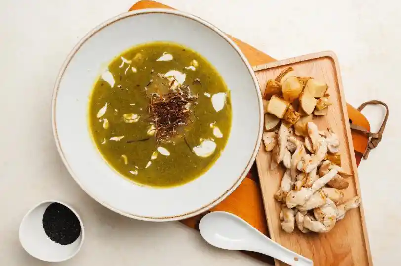 Crema, bondiola, crema de leche, queso mozzarella, papa Capira, lechuga romana, tomate Cherry, pimentón escalibado, vinagreta de soya.