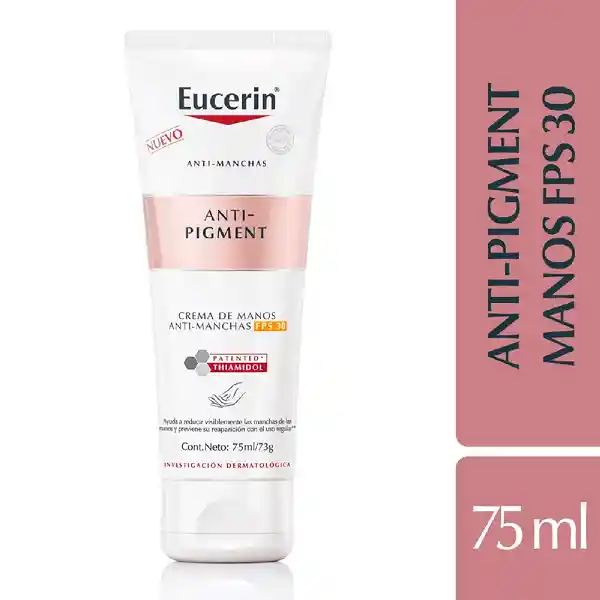 Eucerin Crema de Manos Anti-Pigment para reducir manchas La pigmentación de la melanina es producida por los Melanocitos que dan color a la piel y es la propia de nuestra piel para proteger de los rayos UV. Sin embargo, la sobre-producción de Melanina y su distribución desigual genera manchas de hiperpigmentación en la piel. Para reducir la apariencia de manchas y prevenir su reaparición, creamos Eucerin Anti-Pigment Crema de Manos. La crema se absorbe fácilmente y también es extremadamente efectiva para la hidratación de la piel, dándole una sensación hidratada durante todo el día. Eucerin Anti-Pigment Crema de Manos contiene Thiamidol, un ingrediente efectivo y patentado que actúa en la raíz de la causa de la hiperpigmentación a través de la reducción de producción de melanina. Está clínica y dermatológicamente probado que reduce manchas y previene su reaparición. Primeros resultados visibles después de dos semanas y mejora continuamente con uso regular. Con filtros UVA y UVB (FPS 30) la crema correctora ofrece protección solar efectiva y reduce las posibilidades de que la piel genere manchas causadas por el sol. Las manchas de las manos se reducen visiblemente y la piel se ve pareja y radiante.