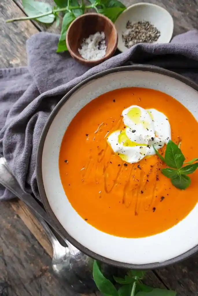 crema de tomate mexicana, Pollo, papa capira, lechuga pepino, cebolla, Vinagreta.