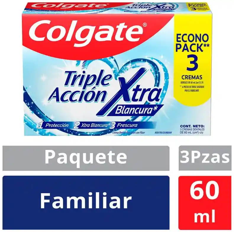 La crema dental Colgate Extra Blancura es una excelente opción para quienes quieren una sonrisa más brillante sin descuidar la salud bucal. Su fórmula de triple acción ayuda a limpiar profundamente, proteger contra las caries y remover manchas superficiales, logrando dientes visiblemente más blancos con el uso diario Al usarla, se siente una limpieza profunda que deja la boca fresca y el aliento agradable por horas. Su acción ayuda a eliminar bacterias en dientes, lengua y mejillas, brindando una sensación completa de higiene que se percibe desde el primer cepillado. Además, contribuye a devolver ese tono blanco natural que muchas veces se pierde por el consumo diario de café, bebidas o alimentos. El paquete de 3 unidades de 60 mL es perfecto para asegurar continuidad en tu rutina, ya sea para uso personal o familiar. Es práctico, rendidor y te permite tener siempre a la mano un producto confiable para el cuidado diario, evitando quedarte sin tu crema dental en el momento que más la necesitas. Si buscas una crema dental que combine frescura, protección y un efecto de blancura visible, Colgate Extra Blancura es una elección que realmente vale la pena. Su equilibrio entre limpieza y cuidado la convierte en una aliada ideal para mantener una sonrisa sana, fresca y con mejor apariencia todos los días