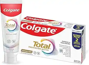 Mantén una buena higiene bucal con la Crema de dientes anticaries Colgate Total Original Mint con Prevención Activa, la nueva versión de Colgate Total, que combate bacterias que son la causa de raíz de los problemas bucales como: bacterias encías, erosión de esmalte, placa dental, sarro dental, mal aliento y caries. La crema dental Colgate Total te ofrece hasta 24 horas** de protección antibacteriana. Previene los problemas bucales más comunes antes de que aparezcan gracias a su nueva fórmula de desempeño superior**** y tecnología poderosa, patentada*** y preventiva. Si quieres prevenir la caries dental, la placa o evitar las manchas en los dientes, esta crema Colgate es la indicada, ya que contiene flúor que ayuda a la prevención de caries y fortalece el esmalte. Úsala con el cepillo de dientes Colgate Total y el enjuague bucal Colgate Total para una limpieza profunda y una protección bucal completa. Luce una sonrisa saludable en todo momento con la crema dental Colgate Total Original Mint. **Con el cepillado 2 veces por día y uso continuo por 4 semanas ***Patentada en Estados Unidos. ****Vs pasta de dientes regular con flúor sin ingrediente antibacteriano