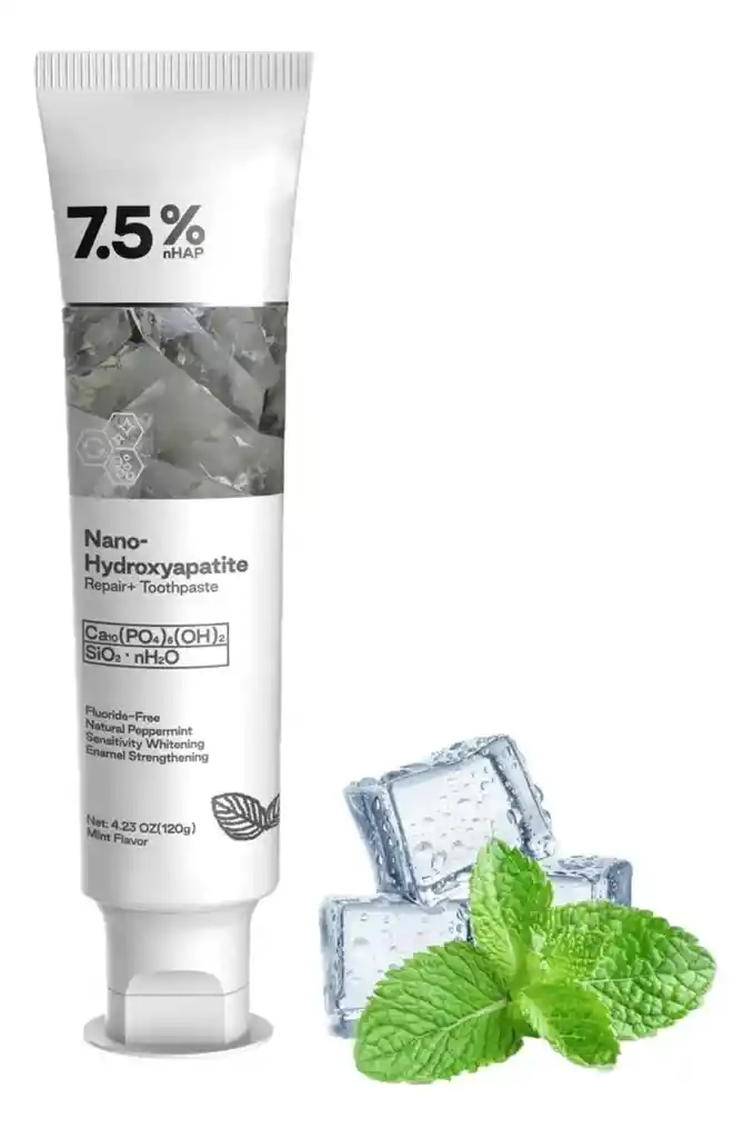Crema Dental Nano hidroxiapatita 7,5% Protección Esmalte Dientes Es una opción ideal para quienes siguen tratamientos dentales estéticos o usan alineadores, ya que ayuda a proteger y restaurar el esmalte durante procesos que pueden sensibilizar los dientes. DESCRIPCION Esta Crema Dental con Nano Hidroxiapatita está formulada especialmente para fortalecer, proteger y reparar el esmalte dental, siendo ideal para personas con dientes sensibles. Gracias a su concentración del 7,5% de hidroxiapatita, un mineral natural que simula la estructura del esmalte, ayuda a remineralizar las zonas dañadas, reduce la sensibilidad y combate el desgaste provocado por la alimentación diaria. Es una excelente opción para quienes buscan una alternativa efectiva y segura al flúor. Su fórmula libre de ingredientes agresivos proporciona una limpieza profunda sin causar irritación, mientras que su refrescante sabor a menta ofrece una sensación duradera de frescura. Esta crema dental no solo protege contra la sensibilidad, sino que también favorece un aliento limpio por más tiempo y fortalece los dientes desde el primer uso. Ideal para el uso diario, garantiza una salud bucal integral con una experiencia suave y eficaz. CARACTERISTICAS -7,5% de nano hidroxiapatita -Libre de flúor -Ideal para dientes sensibles -Repara y fortalece el esmalte -Aliento fresco y duradero -Sabor a menta suave -Limpieza profunda sin irritación -No contiene ingredientes agresivos -Uso diario recomendado -Remineralización activa del esmalte Medidas: Alto: 16cm Diámetro: 3cm Peso: 123g QUE INCLUYE LA COMPRA X1 PASTA DENTAL - HYDROXYAPATITE - ORALHOE - 7.5%