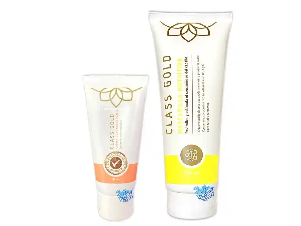 En tu vecino virtual también encontraras : Anyeluz, syam cosmetic, piel de oro, Kaba, class gold, lampiña, Te verde de matcha Benefit, te plus, te latte, te negro, exfoliante, aceite de coco, pomada alfa, colageno hidrolizado,vinipel osmótico, Bioaqua Acne, Mascarillas,tónico, Trendy, la pocion, HGW y muchos mas ————————————————————————————————————————————————— MASCARILLA NUTRITIVA CLASS GOLD PARA EL CABELLO 250ml La mascarilla nutritiva es un producto capilar especial para cabellos sin vida y estancados, estimula el crecimiento del cabello hasta 3cm por mes, además ayuda a controlar el pH del cuero cabelludo, tiene ingredientes como el romero que te brindan estos beneficios y vitamina B2, B6, A y C. Además nutre el cabello y le aporta fuerza, hidratación y brillo, lo fortalece y aplaca ondas rebeldes MODO DE USO: Aplicar el producto antes del baño con el cabello seco haciendo un masaje en toda la raíz y posteriormente extendiéndolo al resto del cabello, dejar aplicado durante 1-2 horas (entre mas tiempo mejor) y pasado este tiempo lavar como habitual, preferiblemente con shampoo sin sal para mejorar los resultados y dañar menos el cabello También se puede utilizar después del baño con el cabello húmedo como crema para peinar y acondicionador Contenido: 250 mL _____________________________________________________________________________ Crema Dermoaclarante class gold BENEFICIOS -Brinda rápidos resultados sobre la zona aplicada, su alto contenido de activos actúan directamente sobre las zonas tratadas promoviendo una piel sana y rejuvenecida. -Elimina puntualmente las manchas pigmentadas de todo el cuerpo y zonas íntimas. - Contiene bambú y vitamina E para no solo despigmentar sino para cuidar y mantener hidratada la piel. - Devuelve a tu piel su tono natural efectivamente y sin maltratarla. - No irrita la piel y la mantiene suave y humectada. - Elimina progresivamente las manchas. - Evita la aparición de nuevas manchas. - Resulta fácil de aplicar. Modo de uso -Realiza una prueba de sensibilidad antes de usar. - Aplica sobre la zona que quieres aclarar uniformemente. - Aplica una vez al día preferiblemente en la noche. - Retirar el producto con abundante agua y jabón. - Puedes utilizar en zonas íntimas, no usar en zonas húmedas. - Si te vas a exponer al sol utiliza bloqueador solar. Contenido 60 ML INVIMA NSOC84084-18CO