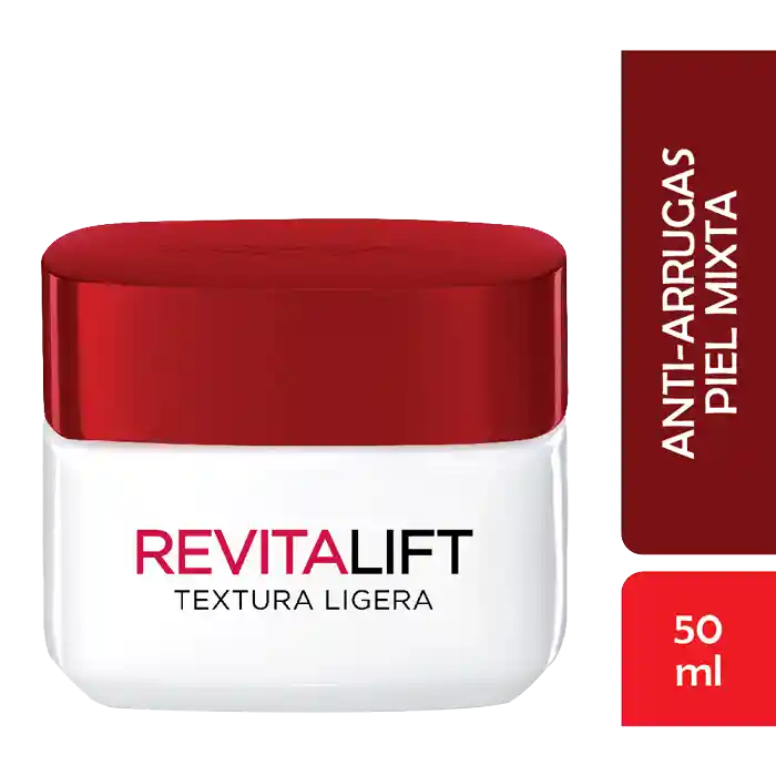 Crema Antiedad L'Oréal Paris Revitalift Día Textura Ligera, con Proretinol y Fibrelastyl que en solo 7 días tendra una acción antiarrugas y mas firmeza con una textura especial para pieles mixtas y grasas.
