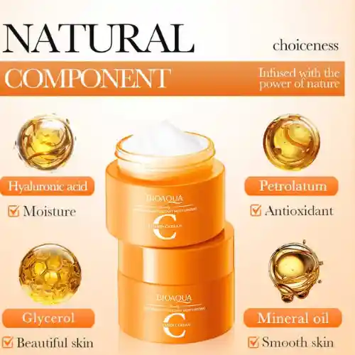 La CREMA FACIAL VITAMINA C NARANJA de Bioaqua es un producto hidratante y antioxidante diseñado para iluminar la piel, combatir los signos del envejecimiento y unificar el tono del cutis. Beneficios: -La crema se destaca por su alto contenido de vitamina C, un potente antioxidante que ayuda a la piel de múltiples maneras. -Antienvejecimiento: Ayuda a combatir las arrugas y las líneas de expresión al estimular la síntesis de colágeno. -Luminosidad: Ilumina el tono de la piel y combate los signos del cansancio, dejando un aspecto más radiante y saludable. -Corrección de manchas: Su uso continuado ayuda a reducir progresivamente las manchas existentes y a unificar el tono general del cutis. -Hidratación: Es una crema hidratante adecuada para todo tipo de piel, incluyendo pieles mixtas a secas, y su textura ligera permite una rápida absorción. -Defensa de la piel: Apoya las defensas naturales de la piel, reparando daños y desacelerando la oxidación celular, lo que previene el envejecimiento prematuro.