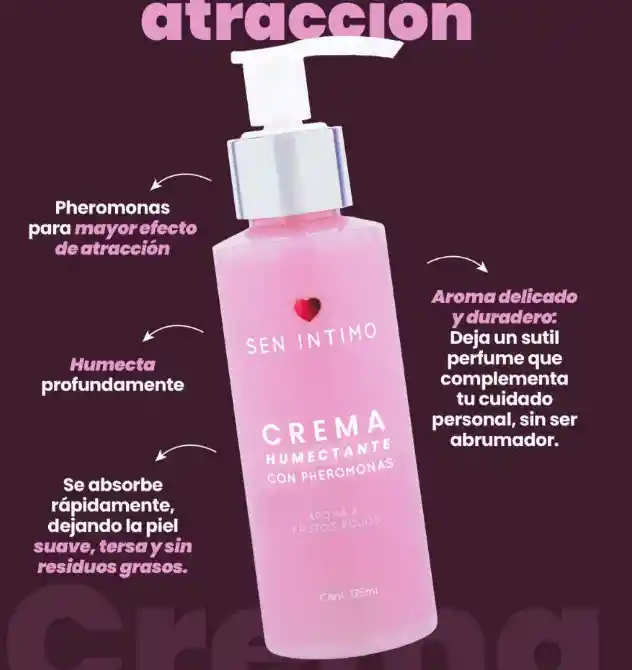 Revitaliza tu piel y aumenta tu atractivo con nuestra Crema Humectante con pheromonas ¿Qué hace por ti? Mantiene tu piel suave y radiante, mientras te ayuda a sentirte más segura y cautivadora. Nuestra Crema Humectante no solo hidrata profundamente tu piel, dejándola suave y brillante, sino que su exquisita fragancia te envuelve en un aroma irresistible que atraerá todas las miradas. Tiene brillitos
