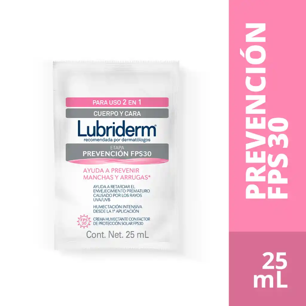 Lubriderm Etapa Prevención FPS30 - Crema Humectante 2 en 1 (25 mL) Crema humectante recomendada por dermatólogos, diseñada para un uso versátil en cuerpo y cara. Su fórmula avanzada no solo hidrata profundamente, sino que también protege tu piel contra los daños causados por el sol.
