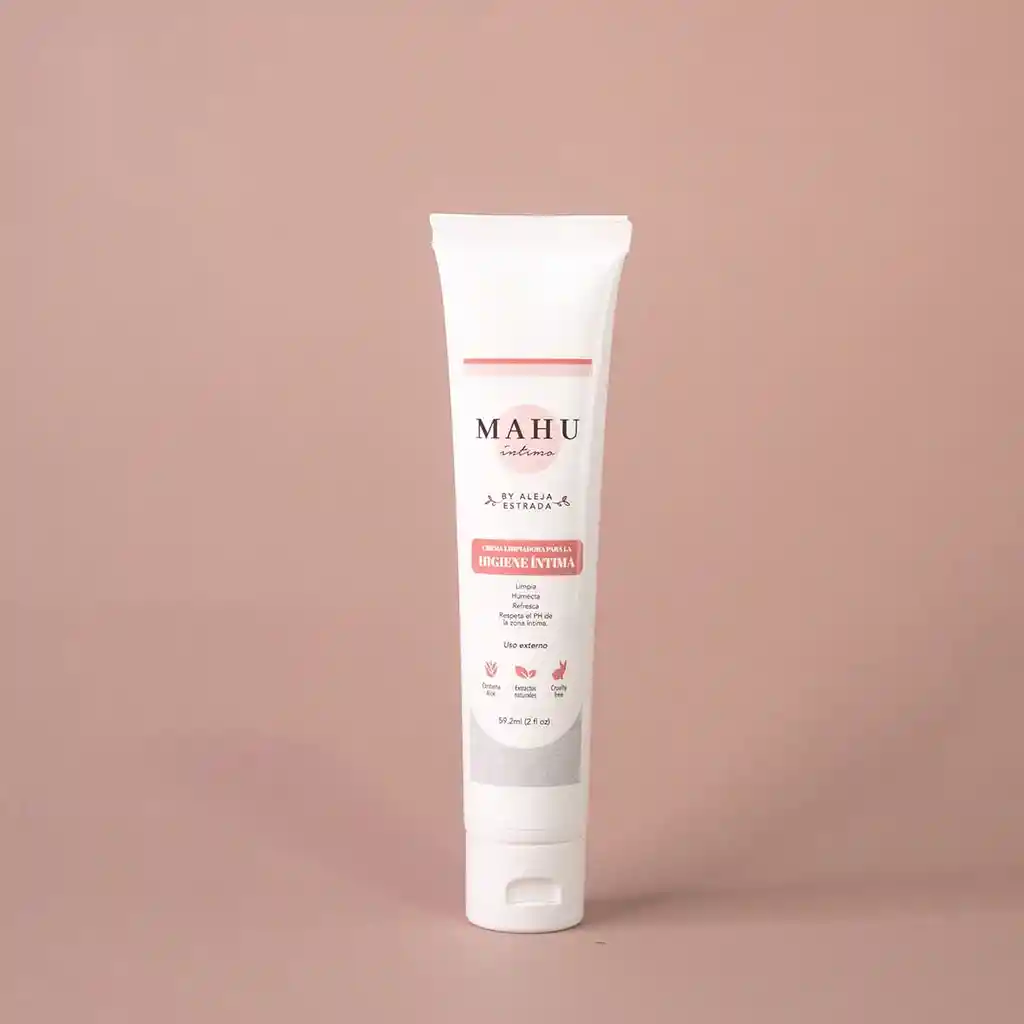 Crema limpiadora para la higiene íntima MAHU By Aleja Estrada, refrescante para ser usada en las áreas externas de la zona íntima. Permite una limpieza suave, sin sensaciones ásperas luego de usar el papel higiénico. Proporciona una sensación refrescante mediante la formación de una capa protectora sobre la piel mientras despigmenta la zona. Respeta el PH de la zona íntima.