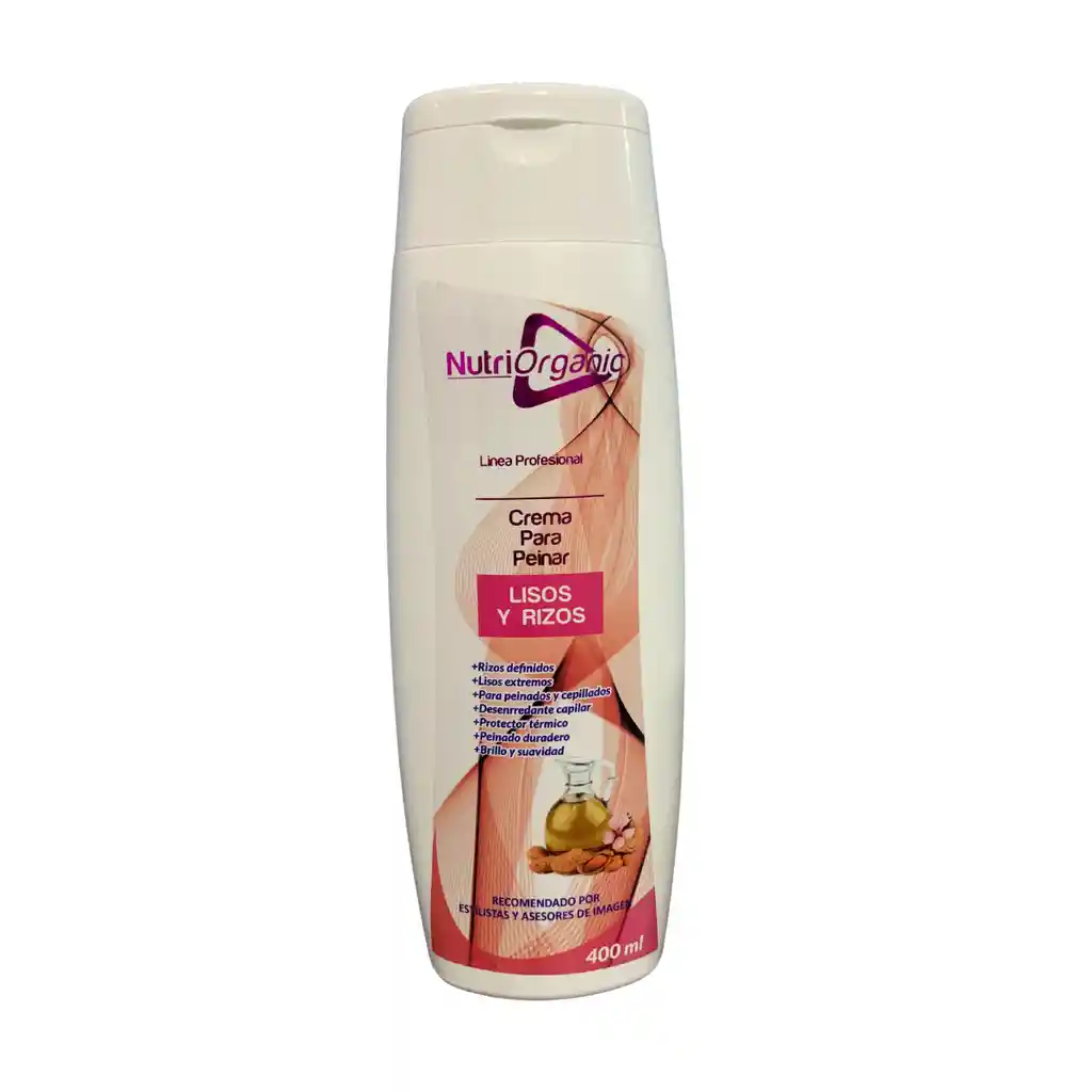 Crema Para Peinar NutriOrganic Lisos/Rizos Multifuncional, especial para suavizar, texturizar y proteger el cabello. Es moldeador antiestatico capilar que le proporciona al cabello facilidad de moldeado, da mas estabilidad, duracion a los cepillados y planchados dejando el cabello muy liso, con mucho brillo. Es termo protector y crea Rizos definidos si lo prefiere, sella la cuticula, da textura sedosa y movimientos naturales.