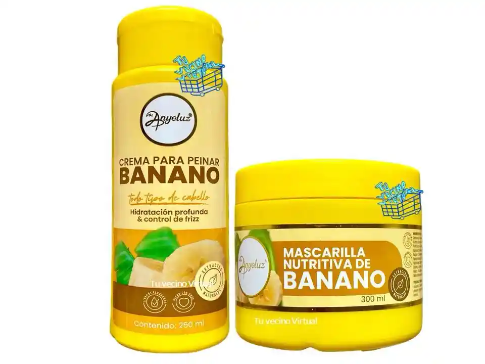 En tu vecino virtual también encontraras : Anyeluz, syam cosmetic, piel de oro, Kaba, class gold, lampiña, Te verde de matcha Benefit, te plus, te latte, te negro, exfoliante, aceite de coco, pomada alfa, colageno hidrolizado,vinipel osmótico, Bioaqua Acne, Mascarillas,tónico, Trendy, la pocion y muchos mas ————————————————————————————————————————————————— Crema Anyeluz de peinar Banano Otorga a la fibra capilar un aspecto brillante y saludable; permitiendo un mejor control a la hora de peinar. Con los beneficios del banano ayuda a controlar el frizz y a mantener el cabello suave y manejable. Los aceites y extractos naturales nutren el cabello y lo hacen mas saludable. Modo de Uso: Lava y acondiciona tu cabello con el shampoo y el acondicionador de banano y luego usa la crema para peinar con banano, no necesitas enjuagarla. Moldea tu cabello de la forma que mas te guste y disfruta de un cabello libre de frizz y sedosidad Contenido 250mL _______________________________________ Mascarilla capilar Anyeluz con Banano La mascarilla nutritiva capilar Anyeluz con banano de 300ml revitaliza y nutre tu cabello, dejándolo suave y con un brillo saludable. Modo de Uso: aplique una cantidad generosa de la mascarilla nutritiva de banano y distribuya uniformemente. En cabello normal o seco desde la raíz hasta las puntas y en cabello graso o mixto de medios a puntas. Puede usar un gorro térmico para potencializar las propiedades del producto. Deje actuar por 30 minutos. Aclare (enjuague) con abundante agua. Se recomienda usar como mínimo dos veces por semana. BENEFICIOS: Su fórmula contiene banano Cabello sedoso y brillante Máxima hidratación y nutrición Con proteínas y aminoácidos Ayuda a fortalecer tu cabello Fragancia deliciosa que perdura todo el día Para todo tipo de cabello Contenido: 300 mL