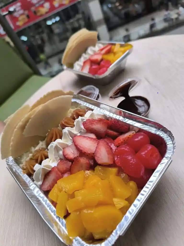 Bandeja de fresa acompañada de cerezas, duraznos, crema suave, arequipe, oblea y salsa de chocolate