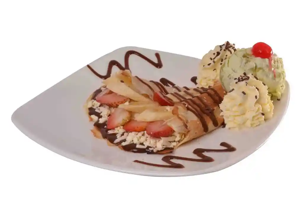 Suave tortilla cubierta de crema de avellanas, rellena con queso, fresas y banano, acompañada de un sabor de helado, crema chantilly y lluvia de chocolate.