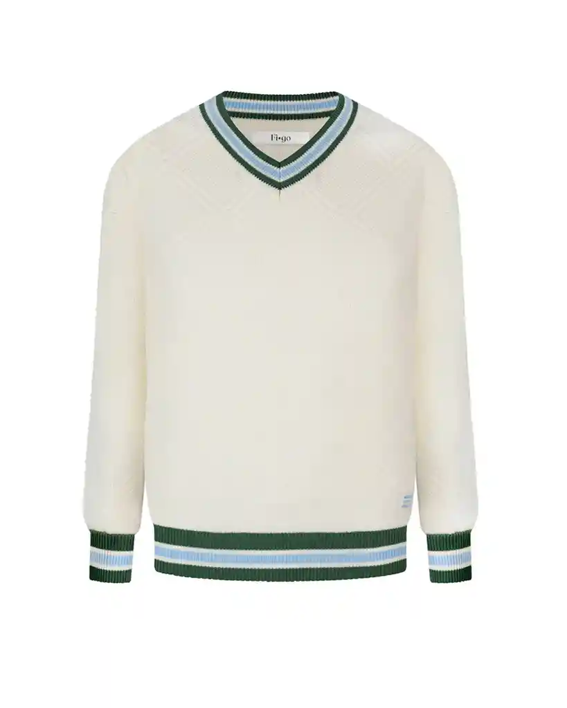 Inspirado en uno de los deportes más clásicos CRICKET. Fresco, cómodo, cool y abrigado a la vez, nunca vas a querer quitartelo! Cuello en V, con detalles al estilo FIGO. Color: Mantequilla Detalles: Azul claro y verde oliva