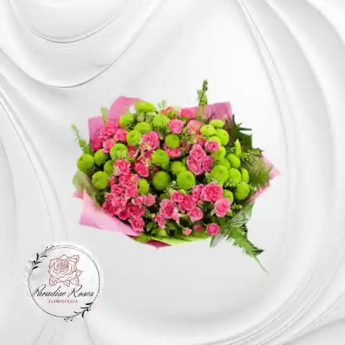 Ramo floral combinado de mini rosas rosadas con crisantemos verdes. Su diseño trasmite ternura y elegancia, ideal para regalar emociones sinceras como C cumpleaños, Agradecimientos.