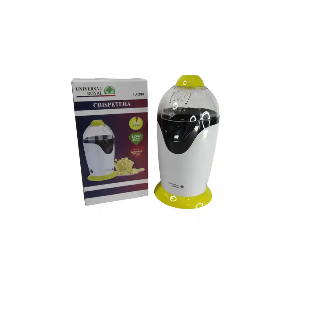 Crispetera sin Aceite UNIVERSAL ROYAL Prepara deliciosas palomitas de maíz de forma rápida y saludable con la Crispetera sin Aceite UNIVERSAL ROYAL. Gracias a su tecnología de aire caliente, no necesitas añadir aceite ni grasas, lo que permite disfrutar de un snack más ligero y crujiente en solo tres pasos. Características: Marca UNIVERSAL ROYAL 1.100 watts de potencia para un resultado rápido y uniforme No necesita aceite ni grasas puedes agregar azúcar, sal, arequipe, salsas, chocolate o caramelo después de prepararlas Cuchara medidora incluida para la cantidad perfecta de maíz Apagado automático de seguridad para mayor tranquilidad Diseño moderno y compacto, ideal para cualquier cocina Tapa desmontable, fácil de limpiar Patas antideslizantes para mayor estabilidad Dimensiones: 30 cm x 16 cm x 16 cm Botón de encendido y apagado para un uso sencillo Uso doméstico únicamente Disfruta de unas palomitas perfectas sin complicaciones con la Crispetera sin Aceite UNIVERSAL ROYAL.