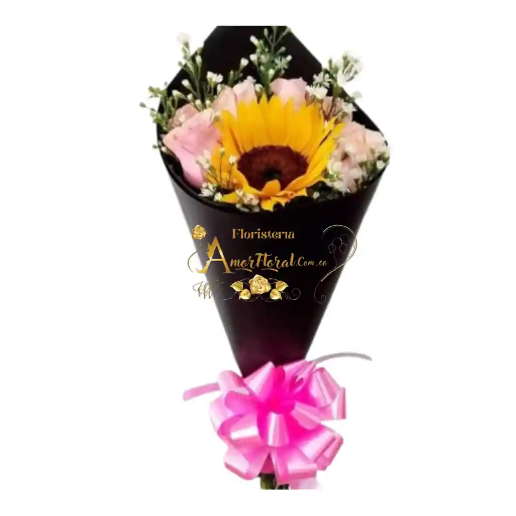 arreglo con 6 rosas y un girasol, si deseas un mensaje para la tarjeta lo puedes dejar escrito en el área de observaciones o escribirnos al whatsapp al 3143111616 y enviarnos el mensaje para la tarjeta.