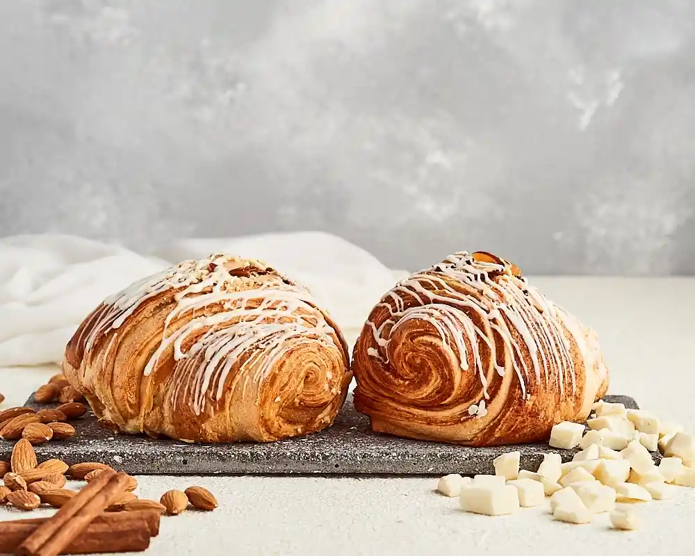 Croissant hojaldrado relleno de crema de chocolate blanco y canela. Corteza: Almendras laminadas y chocolate blanco.