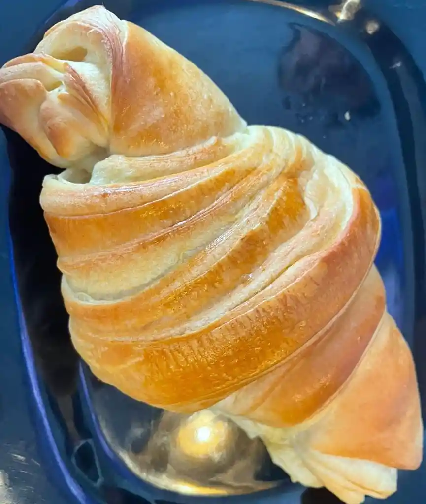 Croissant hojaldrado y dorado, relleno de jamón y queso fundido, con una combinación perfecta de sabor suave y textura crujiente por fuera y cremosa por dentro.