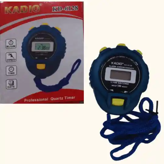 Descripcion: Cronometro Kadio 6128 Cronómetro digital deportivo Kadio sumergible en agua. El cronómetro de la pantalla grande incluye 1/100 de un segundo de precisión y formatos de 12 o 24 horas para corredores, entrenamiento, o entrenamiento deportivo. Especificaciones: - Pantalla LCD de lectura digital tiempo, calendario y visualización de alarmas - Indicador AM / PM, mes, fecha y día de la semana. - Tamaño aprox: 8.45 x 6.65 x 2.55 cm - Longitud de la cuerda: aprox. 54.5 cm - Color: principalmente azul - Material: ABS