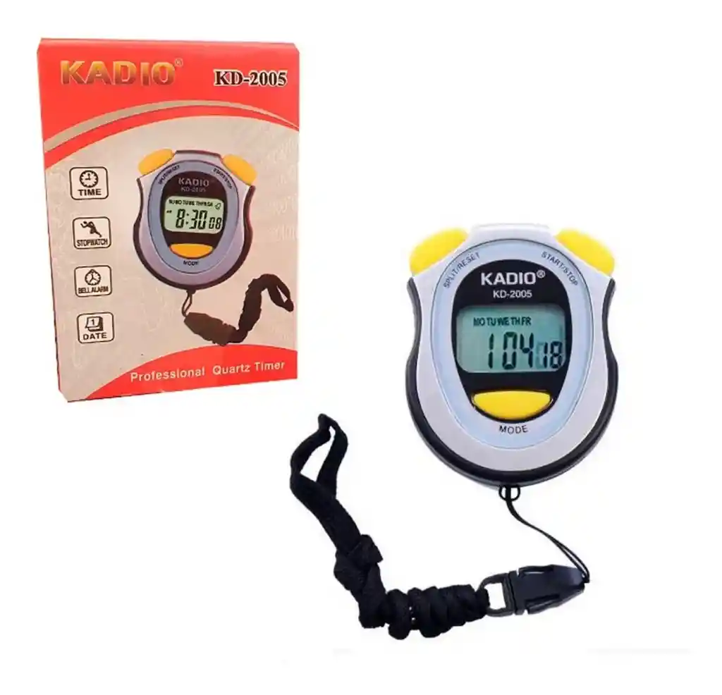 Profesional cronometro de uso deportivo portable, diseñado con su forma para encajar cómodamente en la palma de la mano, con su respectiva correa para el cuello. El cronometro cuenta con hora, alarma y calendario. /// El contenido de la caja es un cronometro, correa y batería ///// Ficha Técnica: Rango de tiempo: 9 horas, 59 minutos, 59,99 segundos Funciones de medida: Reloj, Cronometro, alarma y calendario. Resistencia al agua: No Dimensiones del cronometro: 5.5 cm x 6.5 cm x 1.6 cm Tipo botón de batería AG13 / AG10 (INCLUIDA)