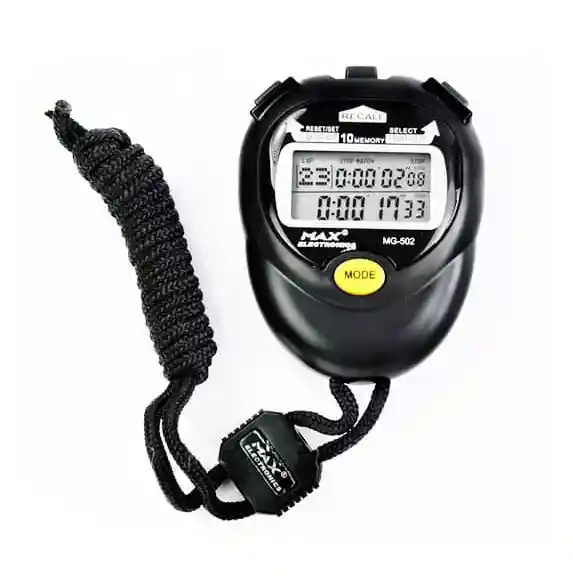 CRONÓMETRO MAX ELECTRONICS MG-502 10 MEMORIAS CALENDARIO ALARMA Cronómetro profesional que mide hasta 10 tiempos, contiene alarma, dos líneas de tiempo para cronometrar el tiempo parcial, recuerda y guarda 10 recorridos, arroja la hora en formato AM/PM y 24h Función de reloj: Puede medir hasta 9 horas 59 min y 59,99 segundos Muestra en pantalla tiempo de vuelta, tiempo parcial y tiempo consecutivo Las primeras 10 vueltas y tiempos parciales pueden leerse de la memoria Guarda el tiempo de vuelta y parcial al mismo tiempo Ideal para todo tipo de deportes, atletismo, natación y más Muestra las horas, minutos segundos, meses, semanas y días Muestra la hora en formato AM/PM y 24h Función cuenta regresiva Función Alarma Diaria Guarda y recuerda hasta 10 recorridos Recarga la memoria después de Borrar y durante la operación Formato 12/24 horas Estructura Resistente al Agua Dimensiones 70 x 65 x 16 mm