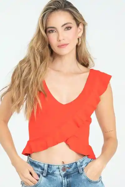 En Tejido de Punto Penélope Fondo Entero Escote en V Con Falso Manga Corta Con un Poco de Vuelo Con Terminación al Corte y Bolero Que Cruza en la Parte Delantera y Rodea Toda la Parte Del Ruedo Silueta Semi Ajustada.