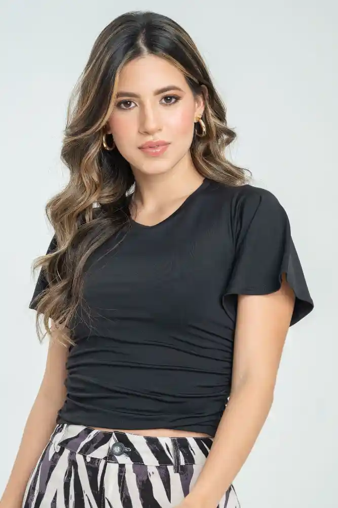 Top en tejido de punto fondo entero, cuello redondo de 2cms, lleva top interno en el frente, manga corta arriba del codo con un poco de vuelo, ruedo de 1cms, largo crop top, recogidos en costados con elástico de 5mm, ruedo de 1.5cms, silueta semi ajustada