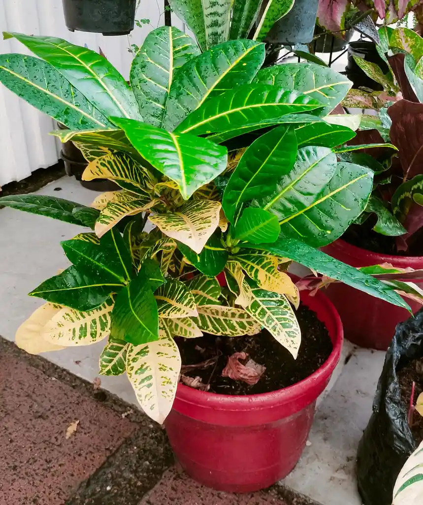 codiaedum variegatum, llamado buena vista de filipinas o crotón amarillo. cuidados : mucha luz filtrada, regar 3 veces por semana y humedecer sus hojas a diario con aspersor ya q les gusta la humedad ambiental.