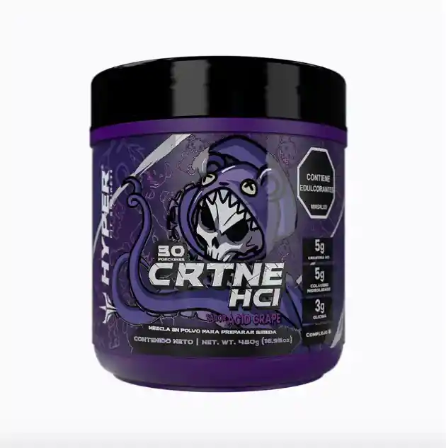 Crtne HCL Nuestra lista de ingredientes es breve, porque la excelencia no necesita complicaciones: 5g de Creatina HCl, dosificada generosamente para que nunca te falte esa chispa extra; 5g de Colágeno Hidrolizado y 3g de Glicina, dos aliados que sin alardes potencian tu salud articular; y Complejo B, usado por deportistas de alto nivel. En cada dosis de 16g te ofrecemos una fórmula limpia y eficaz, sin carbohidratos. Preferimos excedernos en potencia a quedarnos cortos. En HYPER entendemos que los verdaderos Gym Rats buscan más que solo resultados; buscan autenticidad y eficacia.