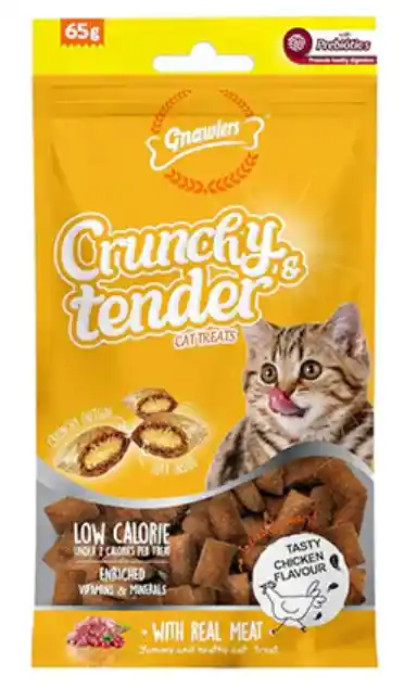 Gnawlers Snack Crunchy & Tender Cat Treats Pollo y Leche 65Gr, consiente a tu gato con la irresistible combinación de texturas crujientes y tiernas de las Golosinas para Gatos Gnawlers Crujientes y Tiernas. Estas deliciosas golosinas tienen un delicioso sabor a pollo y leche , perfecto para satisfacer el paladar de tu gato. Elaboradas con ingredientes de alta calidad, estas golosinas son una excelente manera de consentir a tu amigo felino y, al mismo tiempo, ofrecerle un snack nutritivo.