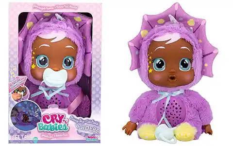 Presiona su barriga y proyecta un cielo nocturno estrellado proyectando estrellas y una luna en cualquier habitación Ella llora las lágrimas de luz LED cuando se retira su paci. Dale un paci y ella dejará de llorar Ella hace 8 sonidos realistas para bebés Ella juega hasta 10 minutos de 5 canciones de cuna diferentes