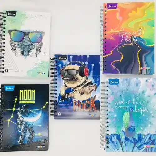 Los cuadernos de 7 materias tienen 175 Hojas. marca Norma son de diseños en alta definición Entre acabados mate o brillantes, con texturas en relieve que dan efecto de reflejo. Estos cuadernos tienen diseños diferentes con colores vivos, con imágenes inspiradoras e interesantes. Son de argollado resistente que no deja que se salgan las hojas.